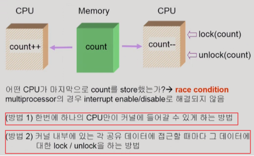 - 두번째, 커널 내부에 있는 각 공유데이터에 접근할 때마다 그 데이터에 대한 lock / unlock을 하는 방법이 있다.