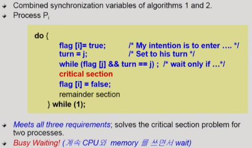 자신의 flag 변수를 true로 만들어 주고 상대방의 flag 변수가 true이면 대기를 하게 되고 false이면 Critical Section에 접근하여 작업한 후 자신의 flag 변수를 false로 만들어 준다.