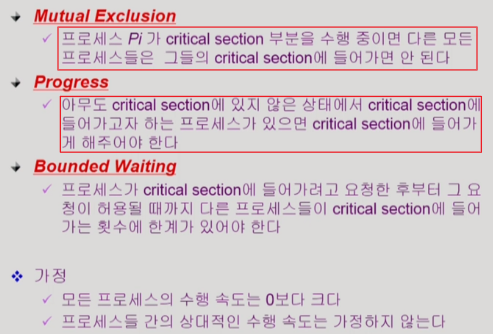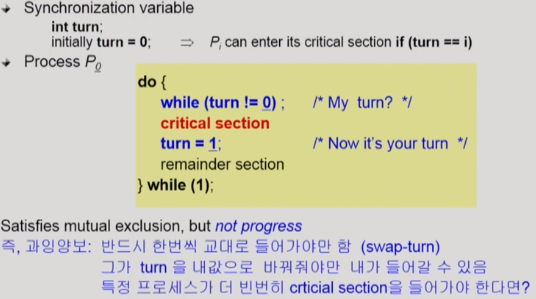 - Progress - 둘이 동시에 들어가는 것을 막고자 하다보니 Critical Section에 아무도 있지 않은 상태에서 들어가지 못하는 상황이 발생할 수 도 있다.