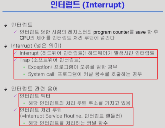 일반적인 Interrupt의 의미는 H/W가 발생시킨 Interrupt이며 S/W가 발생시킨 Interrupt는 Trap이라 한다.
