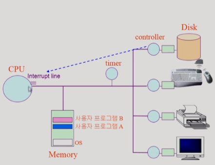 CPU는 interrupt가 오게 되면 진행중이던 다른 '사용자 프로그램B'를 중단하고 운영체제에게 CPU 소유권을 넘기게 된다.