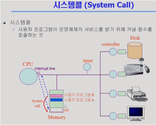 시스템 콜은 사용자 프로그램이 OS의 서비스를 받기 위해 커널 함수를 호출하는 것이다.