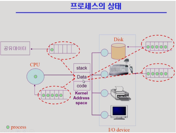 프로세스가 Blocked 상태일 때는 특정 Deivce(H/W) Queue에서 차례를 기다리게 된다.