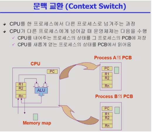 프로세스가 CPU 권한을 넘겨줄 때 CPU H/W 자체의 PC(Program Counter), 레지스터 상태, 메모리 맵을 커널의 해당 프로세스 PCB안에 저장을 시켜 놓는다.