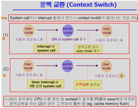 하지만 System Call이나 Interrupt 발생시 반드시 Context Switch가 일어나느 것은 아니다.