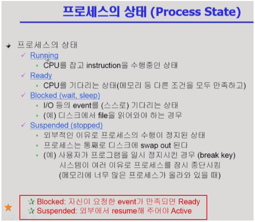 Blocked는 자신의 요청한 일을 하면서 기다리는 상태이다.(Event가 만족되면 다시 Ready상태로 바뀜)