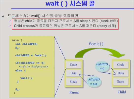 wait() 시스템 콜은 자식 프로세스가 종료될 때까지 기다리는 시스템 콜이다.(block 상태)