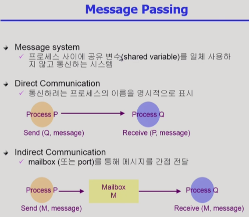 통신하려는 프로세스의 이름을 명시하는 여부에 따라 직접, 간접으로 나뉘게 된다.