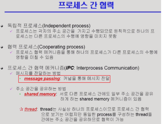 프로세스는 원칙적으로 독립적이기 때문에 메세지를 전달할 수 있는 방법이 없다.